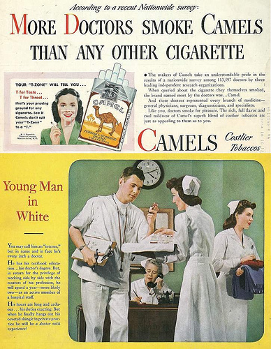 …. o al menos así lo creían de los años 20 a los años 50, las industrias tabaqueras. Para ello utilizaron como imagen de sus campañas publicitarias a actores, deportistas y sorprendentemente a médicos y enfermeras. Un anuncio de 1946 decía en su campaña: «Veinticuatro horas al día tu medico permanece al pie del cañón; un par de cabezadas de sueño, unas cuantas caladas al cigarro… ¡y ya está listo para seguir su trabajo!” . Para quedarse helado !oigan!.